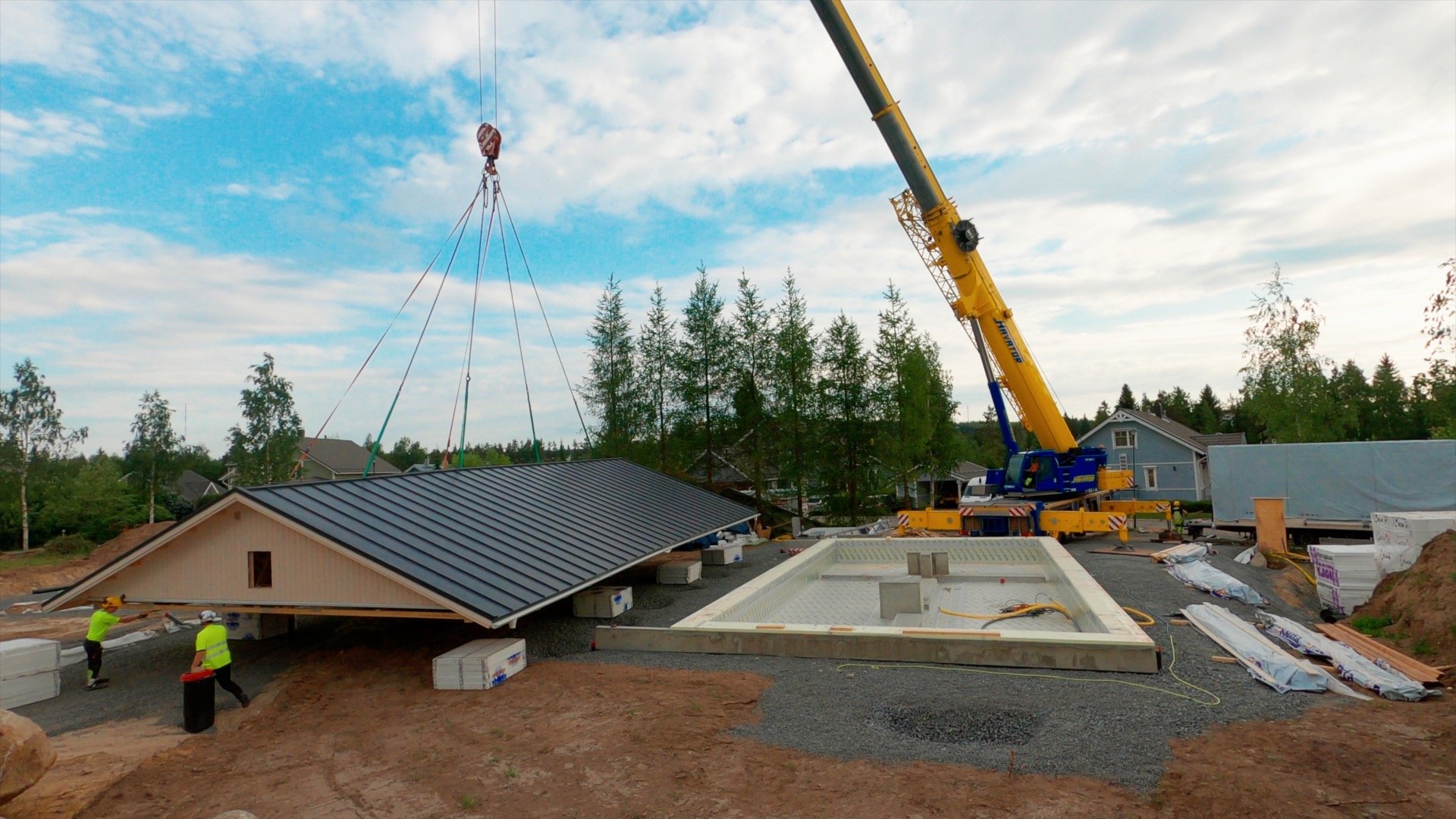 Talon vesikatto rakennetaan heti perustusten päälle, kunnes se taas siirretään talon pystyttämisen ajaksi sivuun. Näin elementit saadaan asennettua täysin kuivan perustan päälle.