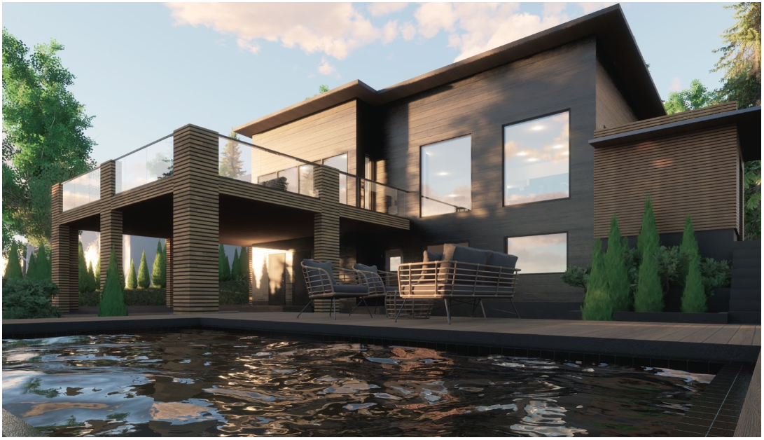 Visualisointikuvat havainnollistavat tulevaa lopputulosta. Suuri terassi yhdistää sisä- ja ulkotilat yhdeksi suureksi oleskelualueeksi.
